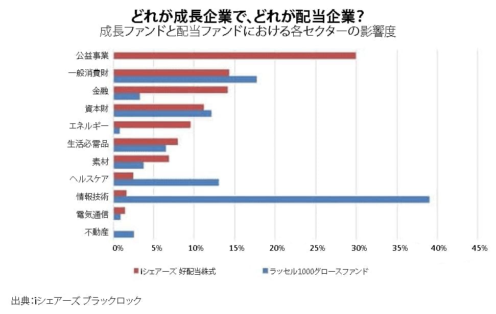 成長企業は、小規模な新興企業である傾向があります(ごく最近株式が公開取引所で取引できるようになった企業)。ただし、これらは、すべての金融市場で(値上り益のために)最大の可能性を秘めた株でもあります。下の図は、業界のカテゴリと相対的な成長率や配当率の比較を示しています。情報技術、一般消費財、ヘルスケア業界で見られる強力な成長傾向に注目しましょう。