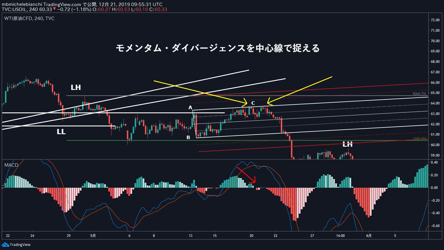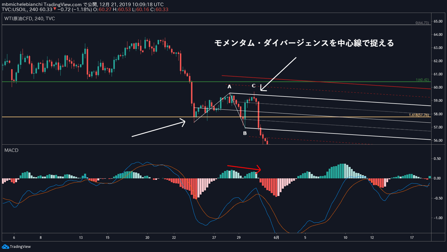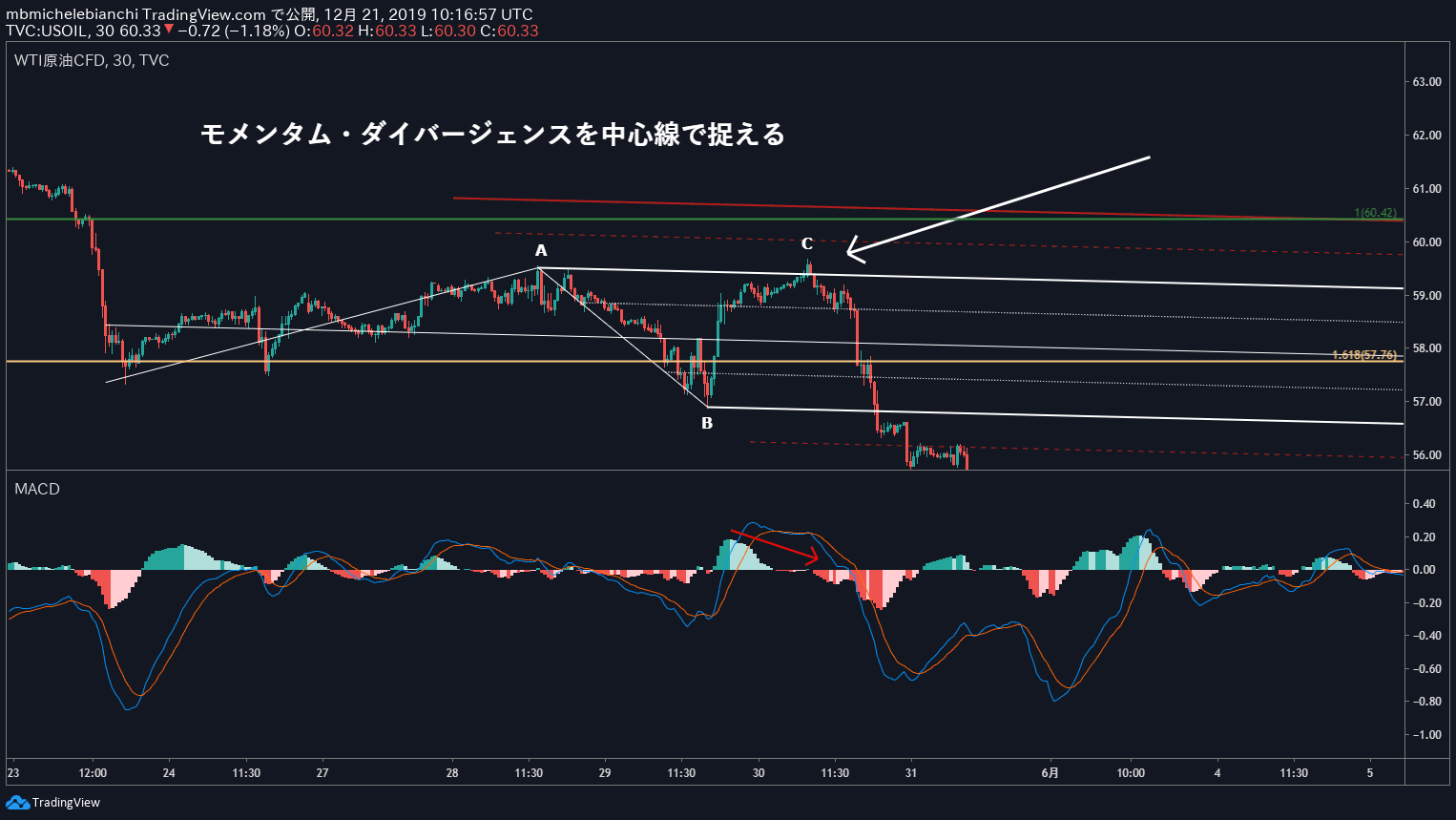 モメンタム・ダイバージェンスがMACDヒストグラムに現れたということで、原油で売りポジションに入ることが可能です。
