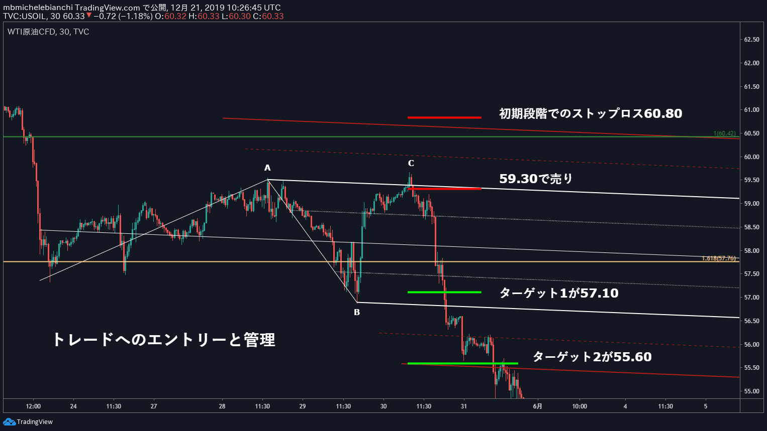 ターゲットは通常2点設けるようにしていますが、最初のターゲットは下方における修正に、二つ目のターゲットは赤い警告ラインに設定しました。