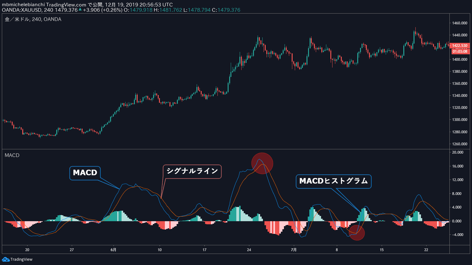 では、MACDラインとシグナルラインが交叉した場合を見てみましょう(赤丸の部分)。MACDがシグナルラインよりも上の場合、MACDヒストグラムはセロラインよりも上か、各線がその逆の動きをした場合はその逆となります。