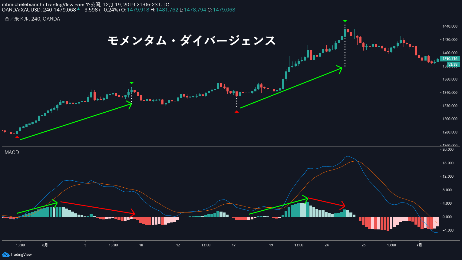 MACDを活用するに際し最も頻繁に使用されるのはモメンタム・ダイバージェンスと呼ばれる状態で、逆方向に向かう前にトレンドが反転することをトレーダーに警告します。