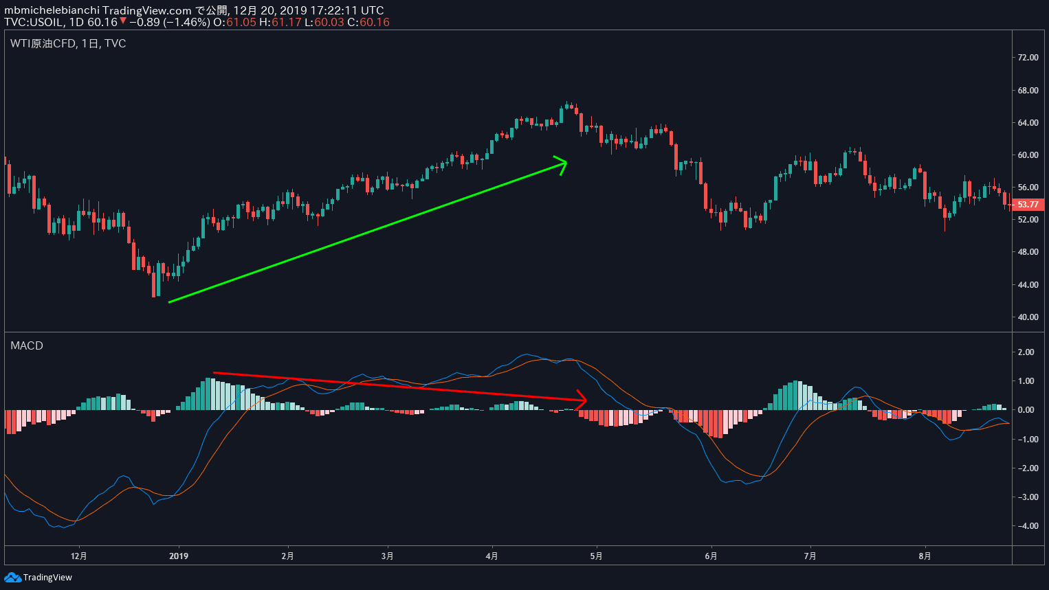 この現象はMACDヒストグラムに表示されたモメンタムが価格上昇が継続される中、枯渇してきていることを示しています。このことを価格とモメンタムがダイバージェンス状態にある、すなわち価格とモメンタムが逆方向に動いていることを示しています。