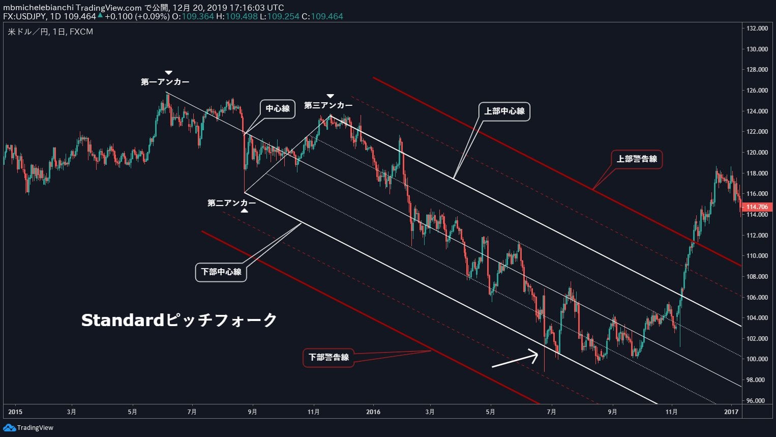 ピッチフォークは通常三本の線からなり、それぞれ中心線と呼ばれています。上のチャートでは中央の線が中心線と呼ばれ、中心線の上部と下部にあるのがそれぞれ上部中心線と下部中心線です。