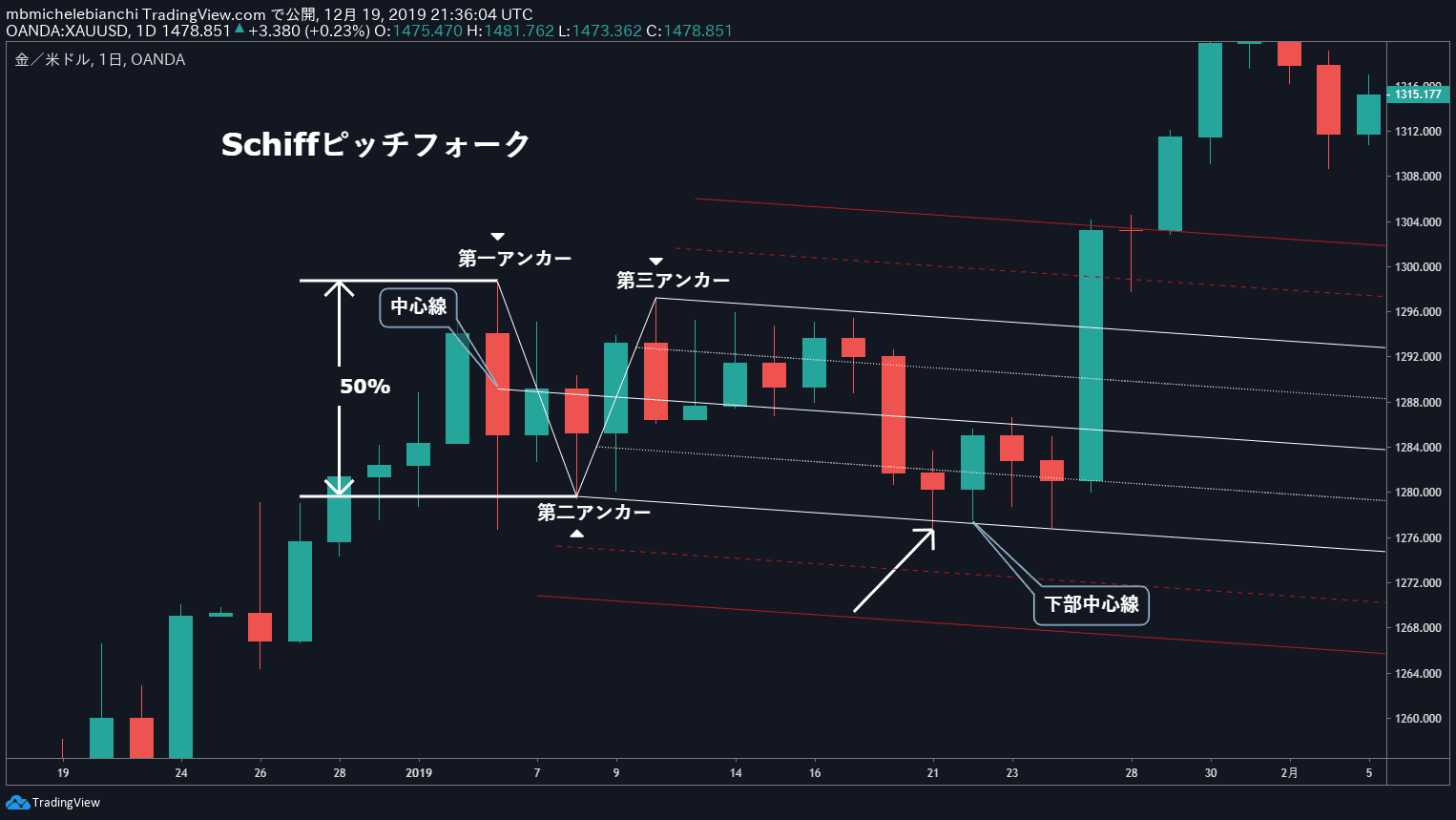 次に見ていくのはSchiffピッチフォークですが、標準ピッチフォークと違いSchiffピッチフォークは角度がもっとなだらかです。Schiffピッチフォークを線画する際もアンカーを選択しますが、中心線の始点が最初のアンカーではないことに注目してください。中央に50%程度の角度を付けたもので、最初のアンカーと二番目のアンカーの間に配置します。