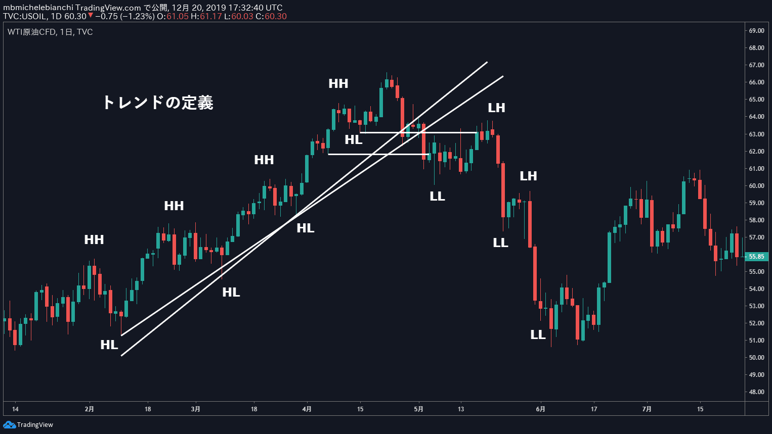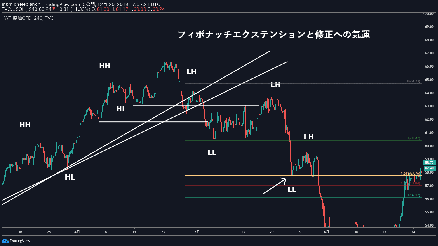 上のチャートにおける基本的なトレンドラインは原油価格の4時間枠を示したもの(青い線)ですが、これはトレンドの方向性を示すものです。価格変動も高めの高値やy高めの安値など、上昇トレンドの相場に典型的な動きを見せています。