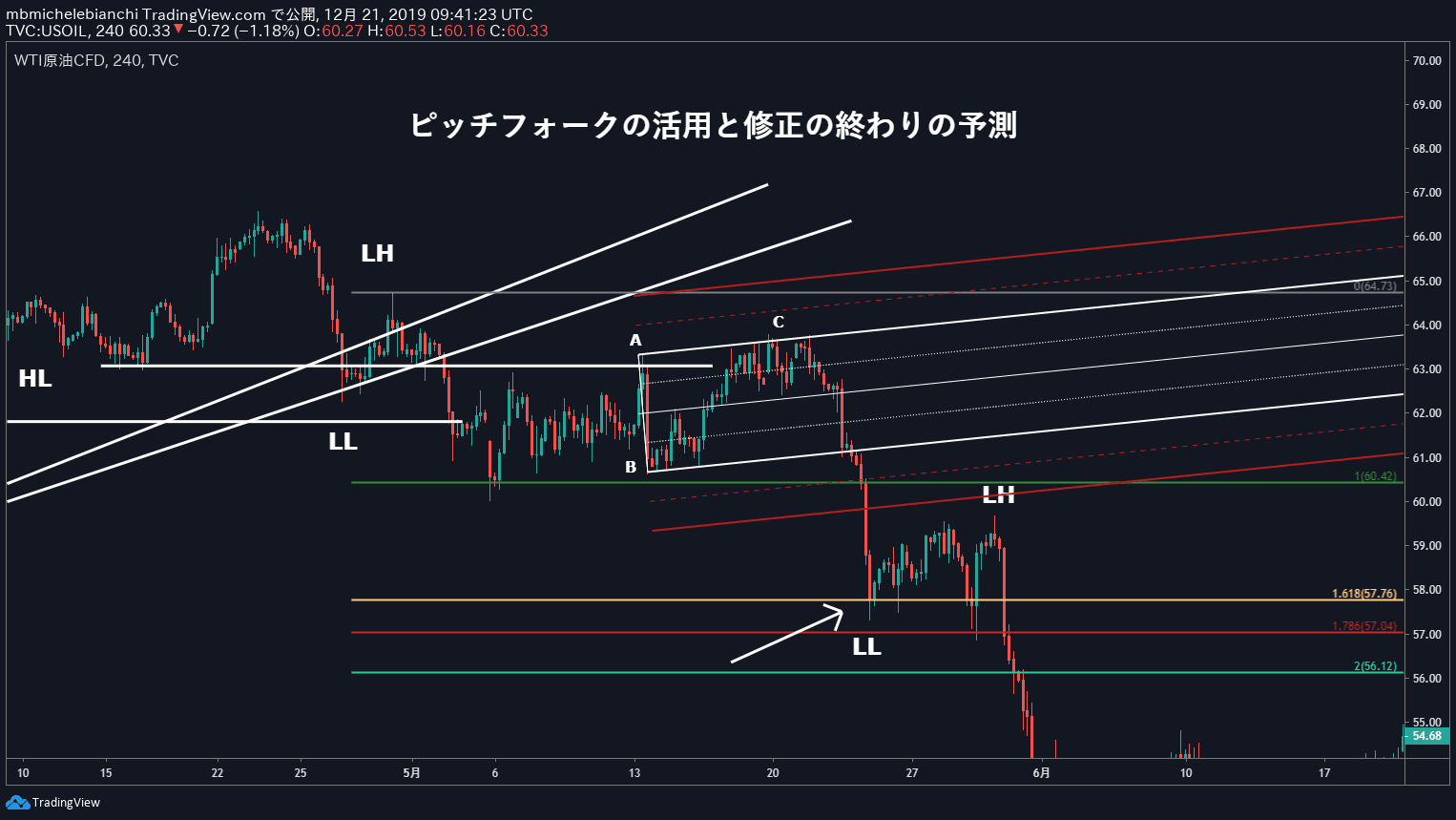 修正内容にラベルを付ける際に具体的なスイングを気にするのでなく、ピッチフォークをガイドとして利用、修正が終わることを確認するまでの準備期間として捉えます。この場合は、修正は長続きせず、Schiffピッチフォークの中心線上部で完了しました。でラベル付けします。