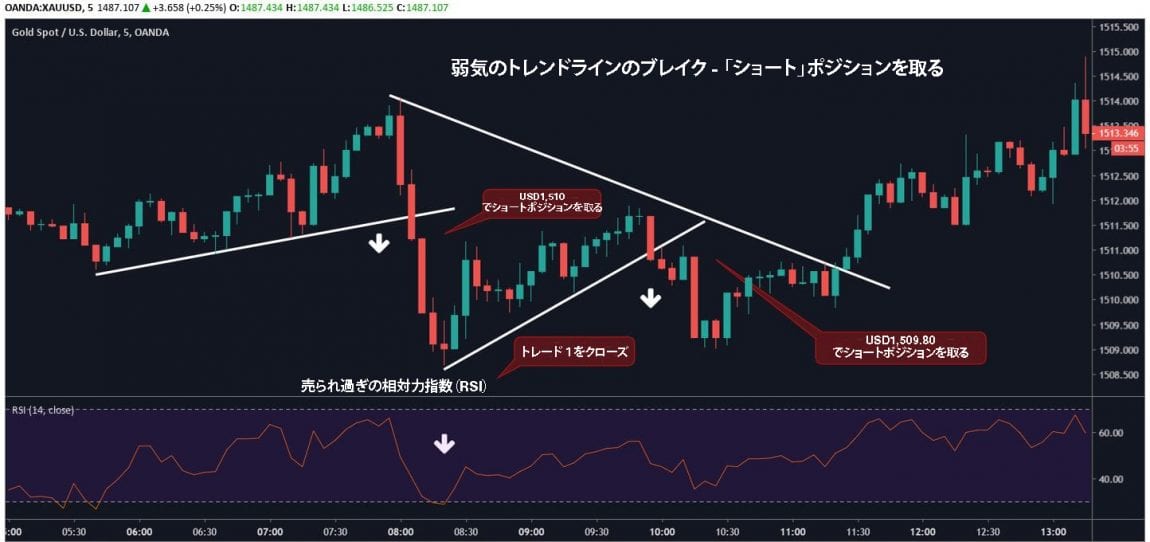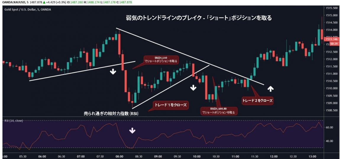 スキャルピングトレーダーは常に次の大きなチャンスを探しています。また、トレンドライン支持線を通じて価格が再び低下すると、別のショートトレードが現れます。これにより、スキャルピングトレーダーは1,509.80ドルで新しいショートポジションをオープンすることができます。