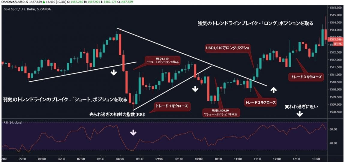 金の価格が5分足チャートの下降傾向ラインを上に抜けると、2番目のショートトレードをクローズするシグナルが現れます。これにより、トレードバイアスが強気に(ポジティブに)なり、ロングポジションで新たな関心が生まれます。この例では、スキャルピングトレーダーは3番目のトレードをオープンすると同時に2番目のトレードをクローズする場合があります。