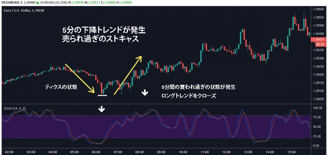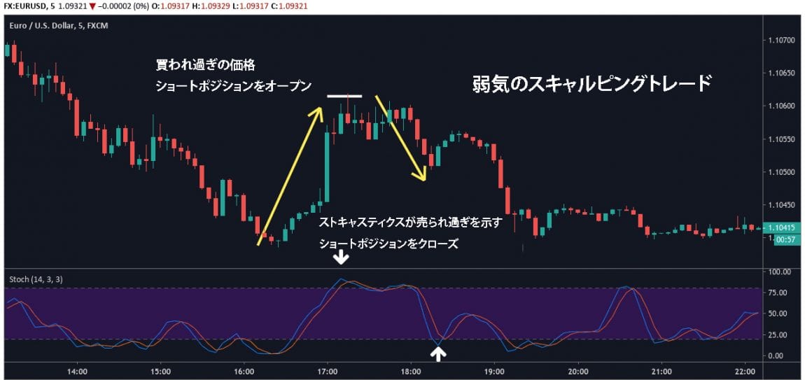 この例では、5分間のチャートは、価格が買われ過ぎの領域に達したことを示しています。これは、スキャルパーがショートポジションを開始するのに使用する可能性のある弱気のシグナルです。このトレードのストップロスラインは、ストキャスティクス指標で買われ過ぎの測定値ができた高値の上に設定します。価格が下がると、スキャルパーは取引をクローズするための十分な証拠を探します。ストキャスティクスの測定値が売られ過ぎの領域に移動し、資産価格が上昇し始めようとする可能性が高まっているため、取引を迅速にクローズする必要があります。