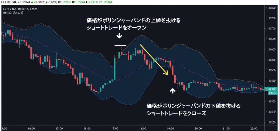 上記の例では、熟練スキャルパーはショートポジションをオープンする理由として、このシグナルを使用します(元のシグナルの原因となった価格水準より高い水準でのストップロスと併せて)。このポジションスタンスの背後にある理論的根拠が無効になるまでショートポジションを取り、これは価格がボリンジャーバンドの下値を抜ける時に起こります。これが発生すると、スキャルパーは取引を終えて、そのポジションで利益を獲得することができます。