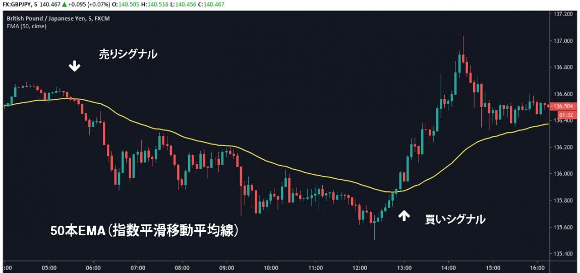 このチャートの例では、スキャルパーが指数平滑移動平均線(EMA)を使用して位置を確立する方法を見ることができます。価格が50本EMAを下回ると、売りシグナルが発生してショートポジションを確立できます。逆に、市場価格がEMAの境界線を超えてロングポジションが確立されると、買いシグナルが現れます。このように、EMAは動向の方向性を決定する優れた方法で、どの取引所でも特定の取引パラメータを調整することが可能です。