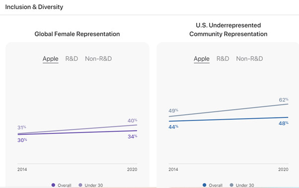 Whilst some of the environmental targets are long-dated and hard to pin down, Apple’s strength in terms of equality and diversity is backed up by hard data. For starters, Tim Cook is the only openly gay CEO of a Fortune 500 company.