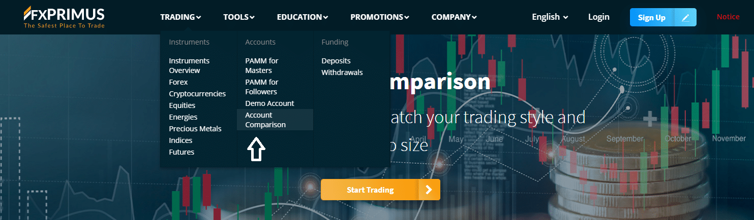 - To open a Live Account, go to the ‘Accounts’ section from the ‘Trading’ tab on the website and click on ‘Account Comparison.’