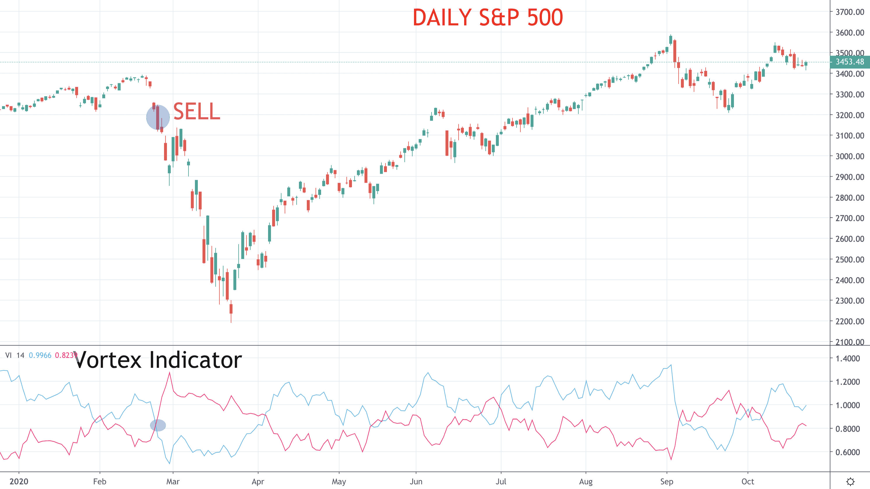 In this first example in the chart below (Figure 2), the Votrex Indicator gave a negative signal with the +VI crossing below the -VI on 25th February 2020. This was a very early signals and presented a great entry price for a shirt at the start of the global spread of thee COVID-19 pandemic. A stop would be placed above the swing high from February and a trailing stop-loss could be used.