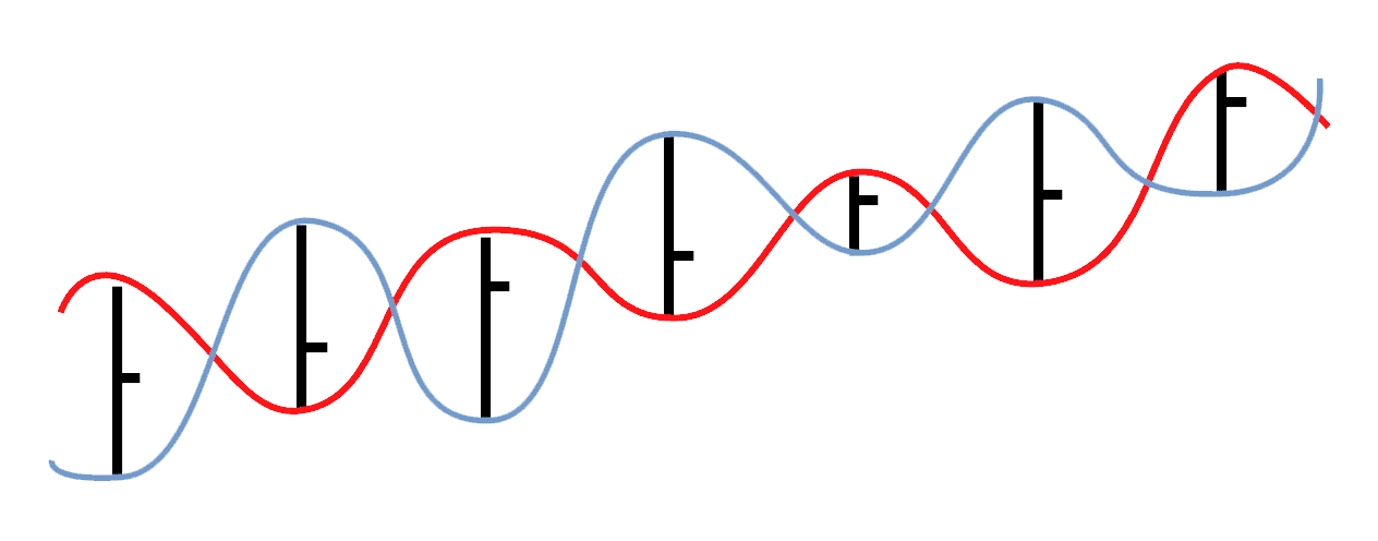 The vortex indicator is constructed from the highs and the lows from the last two trading periods (for example the past two trading days). The distance from the current period (day) high to the prior period (day) low signals a positive movement in trend. The measure between the current period low and the preceding period high defines a negative trend movement. This can be seen in Figure 1 below.