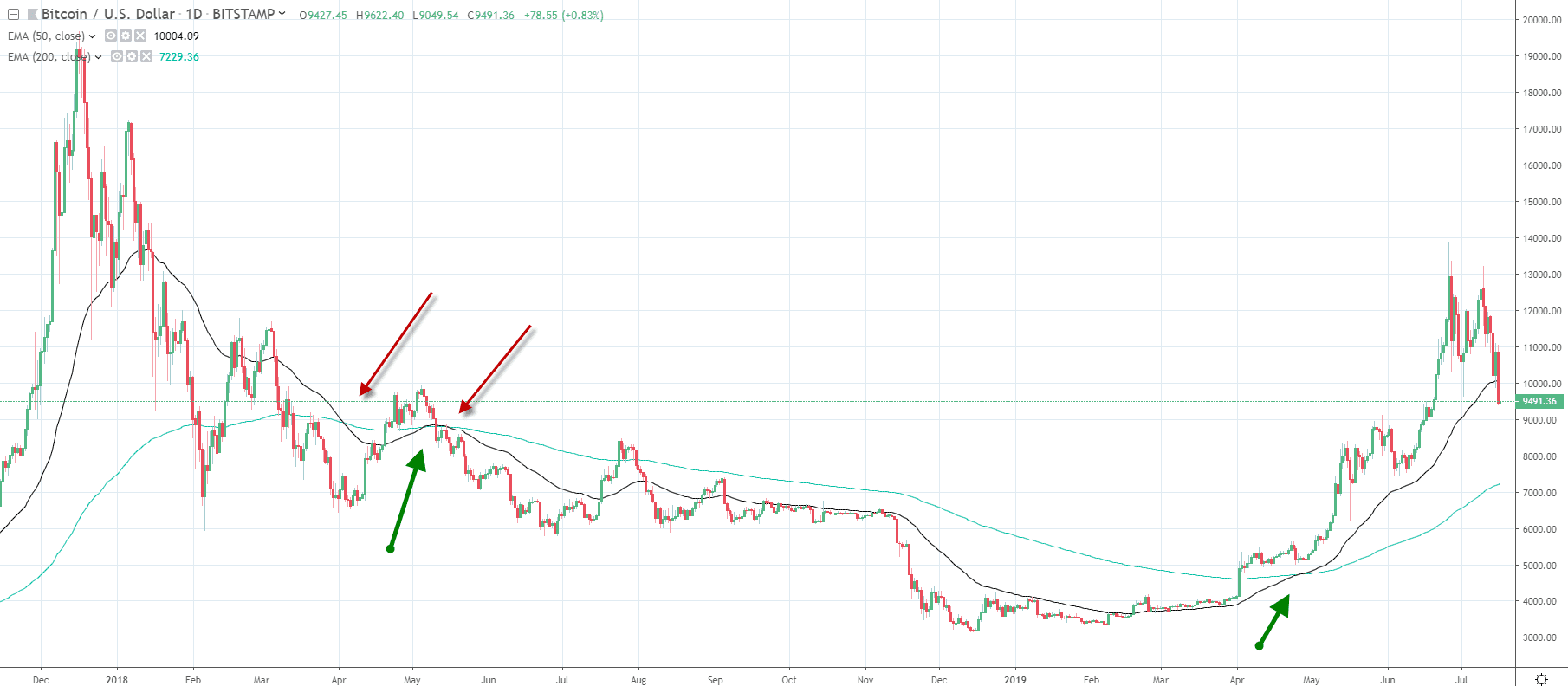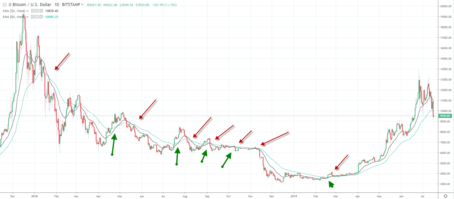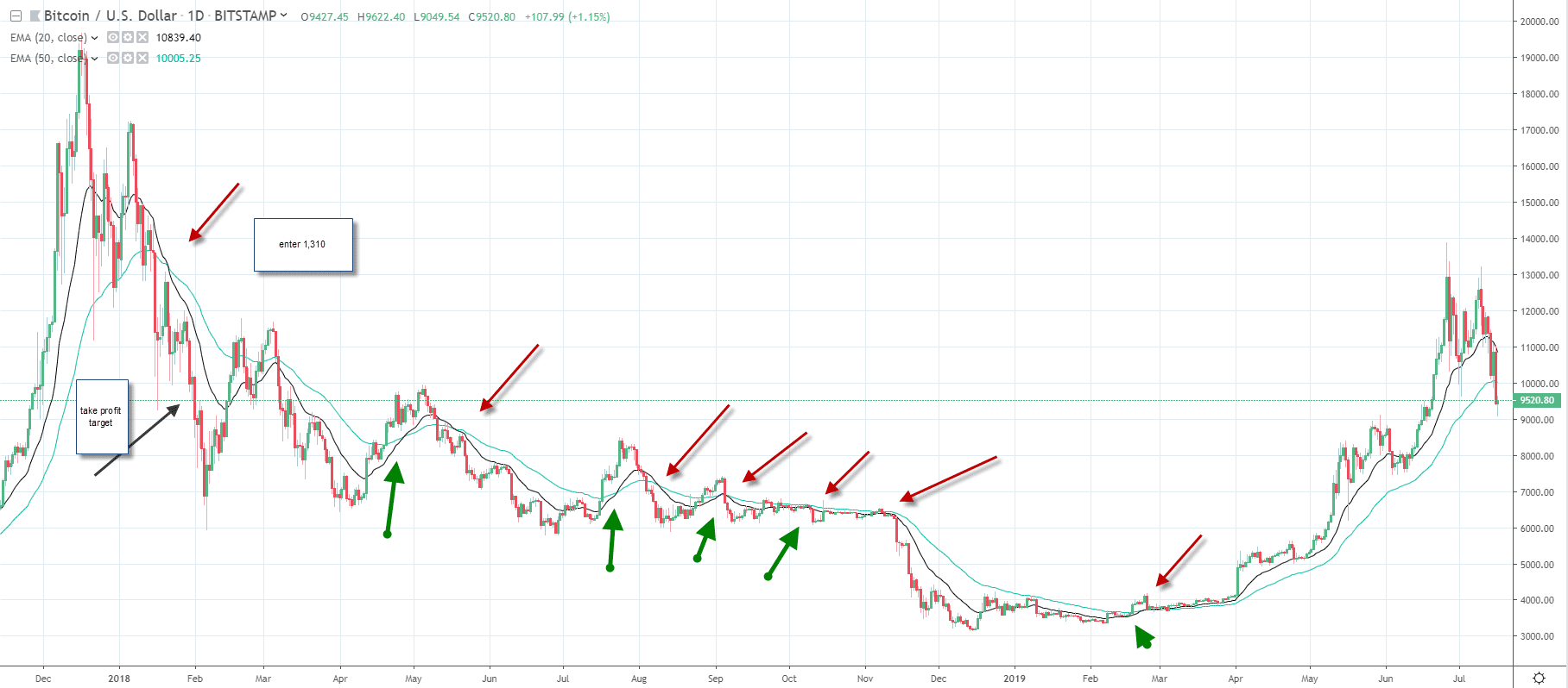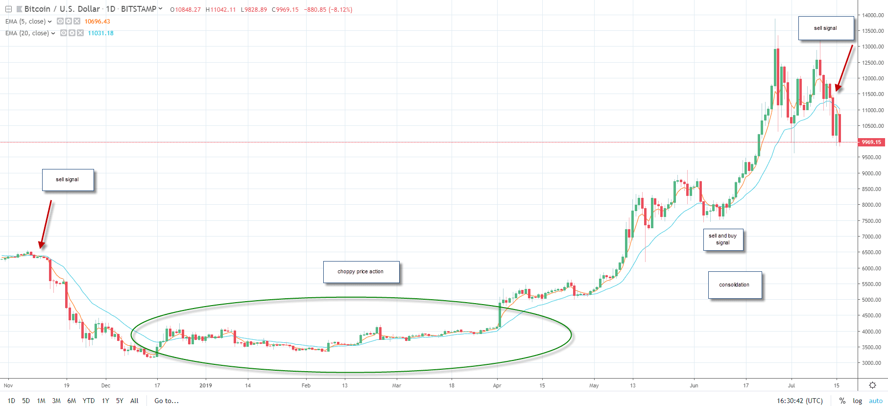 Perkara penting yang perlu difahami tentang EMA adalah ia tidak boleh digunakan sepanjang masa. Harga aset hanya melonjak 30% daripada masa. Pengurusan risiko anda akan memainkan fungsi yang penting dalam kejayaan strategi pindah silang EMA. Apabila menggunakan strategi perdagangan seperti EMA, matlamatnya adalah untuk menjana pendapatan yang kukuh apabila harga bitcoin mula melonjak.