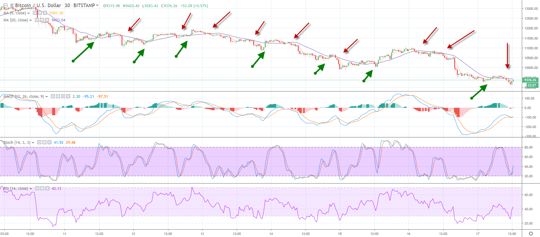 - Dua dagangan pertama dalah dagangan yang kalah, kerana Bitcoin didagangkan secara mendatar.
