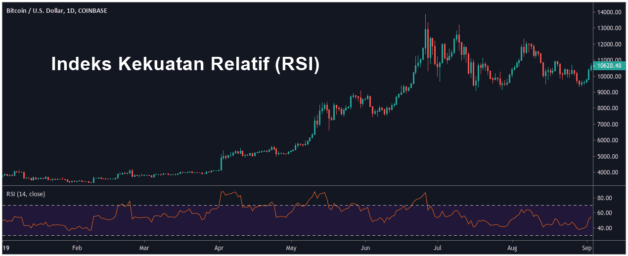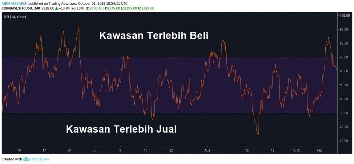 - RSI menjejak harga pasaran sebagai pengayun momentum, bergolak antara dua ekstrem yang dicartakan (0 dan 100).