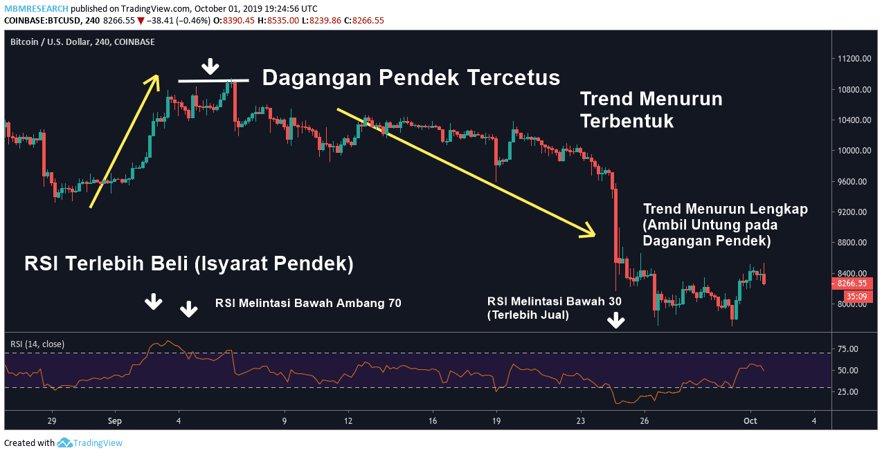 Pada tahap ini, dagangan pendek perlu dimulakan dengan henti rugi di atas tahap tinggi harga yang mencipta bacaan penunjuk terlebih beli pada RSI (garis mendatar berwarna putih). Traders akan meletakkan henti rugi di kawasan ini kerana isyarat jual akan menjadi tidak sah sekiranya harga boleh bergerak di atas kawasan ini pada masa hadapan. Sasaran keuntungan pada kedudukan pendek perlu diletakkan pada jarak sekurang-kurangnya 3x daripada jumlah risiko dagangan (jarak antara titik kedudukan entri dan henti rugi).