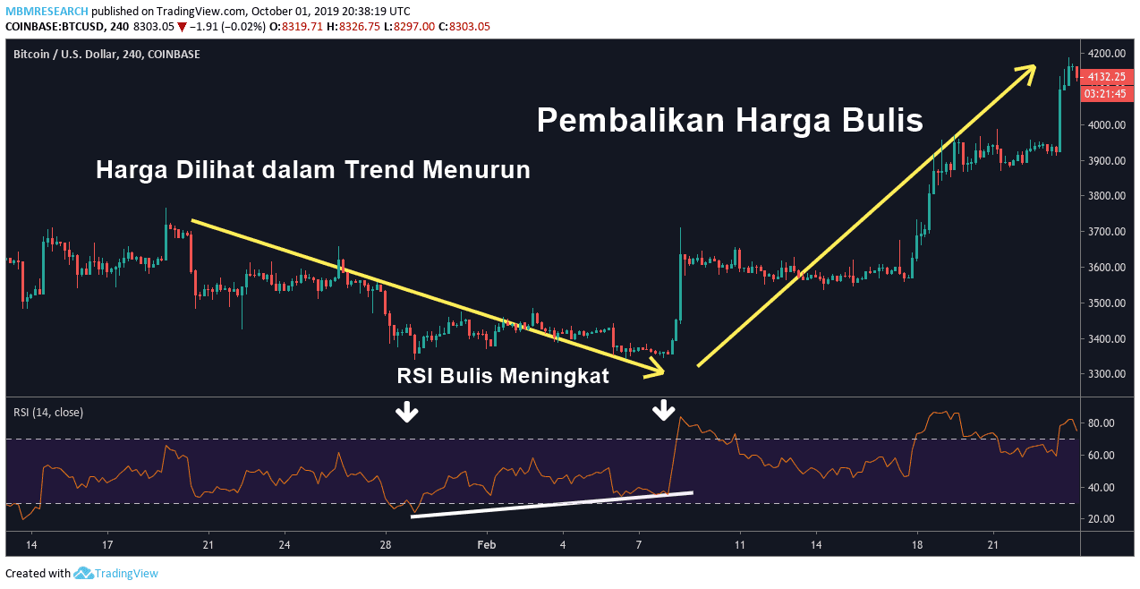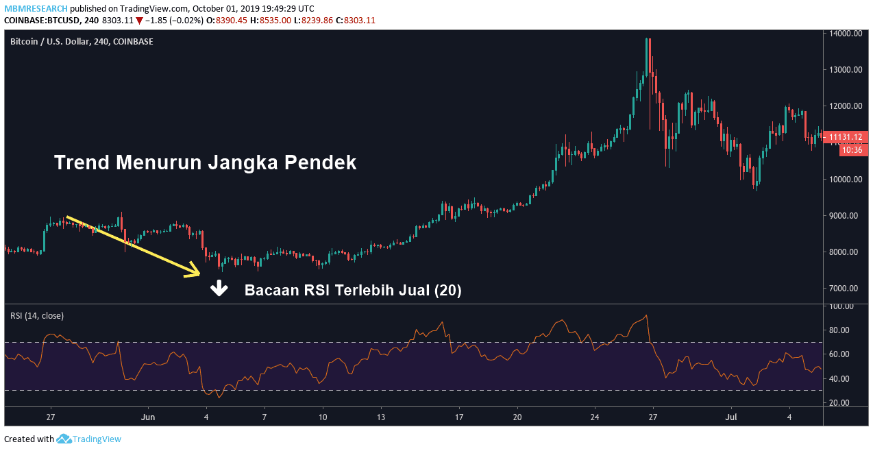 Dalam contoh dagangan RSI yang seterusnya, kita dapat lihat senario bulis mula terbentuk. Harga pasaran dalam BTC/USD dilihat berada dalam trend menurun jangka pendek (bahagian kiri carta). Situasi ini menghantar nilai penunjuk RSI ke bawah ambang terlebih jual (mencecah 20). Pada tahap ini, Traders akan melihat isyarat ini sebagai potensi peluang untuk membeli BTC/USD sekarang kerana aset telah terkurang nilai.