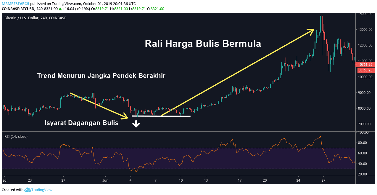 Mari lihat pada contoh tentang bagaimana isyarat-isyarat ini muncul pada carta harga masa nyata. Di bahagian awal sejarah carta BTC/USD (bahagian kiri carta), kita dapat lihat bahawa penilaian BTC berada dalam rali jangka pendek: