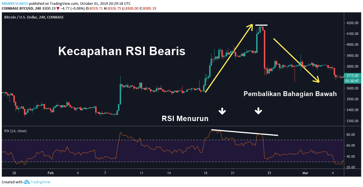 - Kecapahan RSI boleh ditemui apabila pergerakan harga utama (rali atau menurun) tidak disahkan oleh penunjuk statistik objektif, mencadangkan harga perlu kembali ke purata sejarahnya.