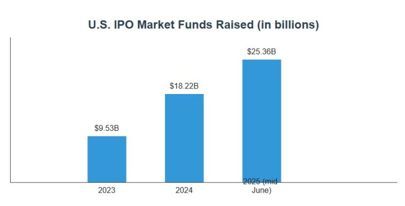 The IPO market’s performance can thus serve as a leading indicator of overall market health. The increase in the U.S. IPO market, which raised $25.36 billion by mid-June 2025, compared to $18.22 billion in 2024 and $9.53 billion in 2023, is a clear indicator of growing investor confidence as markets hit new highs.